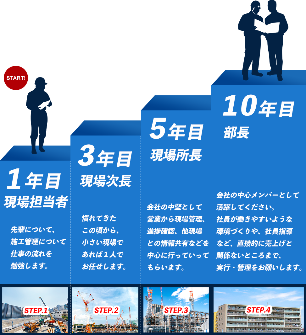 一人前になれる秘密がレインビルダーにはあります。 私たちは、みなさんが着実に成長し、施工管理のプロとして現場を仕切れるようになるためにバックアップしていきます。